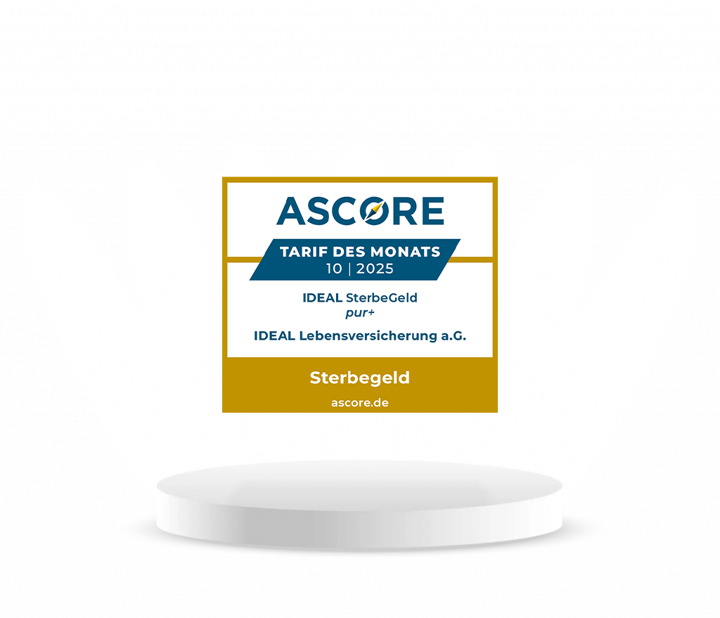 Der Tarif “IDEAL SterbeGeld pur+” der IDEAL Lebensversicherung a.G. in der Kategorie Sterbegeld erhält von ASCORE Analyse die Auszeichnung Tarif des Monats.
