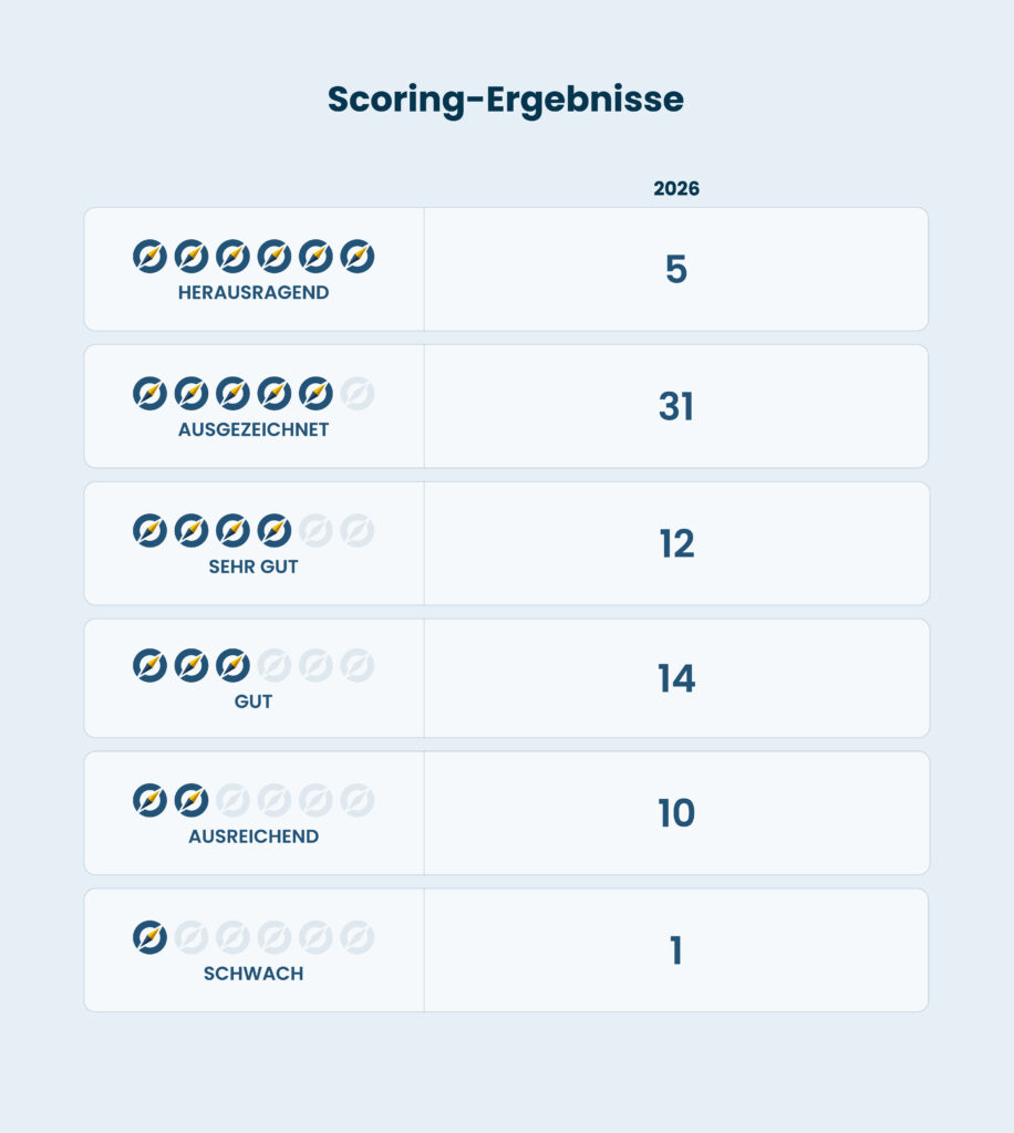 Die Bewertung erfolgt auf Basis eines klar strukturierten Punktesystems: Für jedes erfüllte Kriterium wird ein Punkt vergeben. Die daraus resultierende Gesamtpunktzahl wird anschließend in das bewährte 6-Kompass-System überführt und durch eine anschauliche Kompassgrafik visualisiert – für maximale Transparenz und schnelle Vergleichbarkeit.